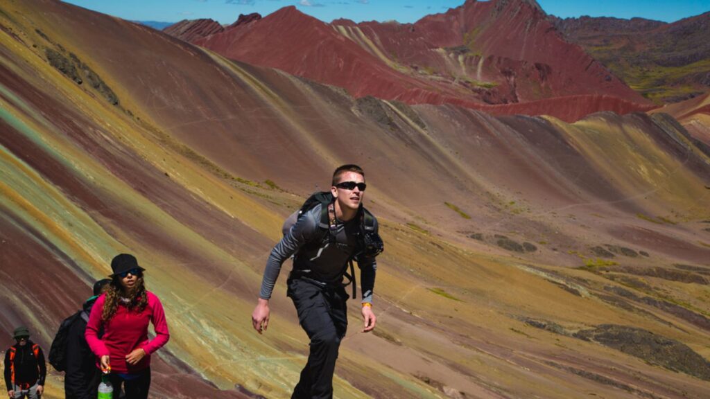 La caminata a Vinicunca tiene una dificultad moderada debido a la altura y dura aproximadamente 4 horas entre ida y vuelta, dependiendo del ritmo de cada viajero. Durante el recorrido podrás apreciar paisajes andinos, montañas nevadas y comunidades locales. Si el ascenso resulta exigente, existe la opción de alquilar caballos en la ruta.